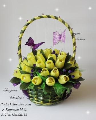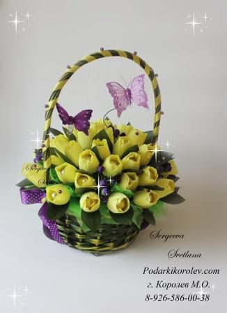 Жёлтые тюльпаны, Корзина тюльпанов, Доставка Королёв, Москва, Мытищи, Пушкино, Ивантеевка, Софрино, Щелково и др. Подарок бабушке, тёте, сестре, руководителю, начальнице, подруге, коллеге, тёще, свекрови. Подарки ручной работы на заказ в Королеве, Букет из конфет в корзине на заказ в Королёве, Букет цветов на заказ в Королёве.