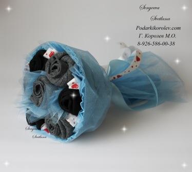 Букет из носков. Стоимость 900 руб. Букет состоит из 7 пар носков черного и серого цвета. Возможно изменение цвета и состава композиции. Диаметр 20см.