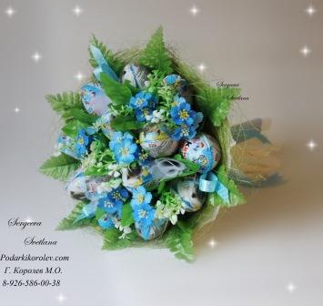 Киндер букет. Стоимость 1850 руб. Оригинальный ручной букет из киндер сюрпризов. Чаще заказывают для любимых девушек, чем для детей))))) Порадуйте родных, близких и знакомых нестандартным авторским подарком. В составе 13 киндер сюрпризов. Диаметр 30см, высота 33см