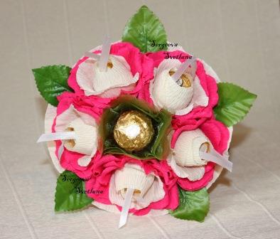 Миник №7. Стоимость 800 руб., от 3-х шт. 700 руб. Букет с 6 конфетами Осенний вальс, стоимость 700 руб., с конфетами Марсианка 600 руб., с конфетами Ферреро Роше 800 руб. Можно сделать с Вашими любимыми конфетами и в других цветах) Диаметр примерно 15 см. Срок изготовления букета из конфет 1-5 дней. Перед праздниками лучше заказывать за 2-4 недели.