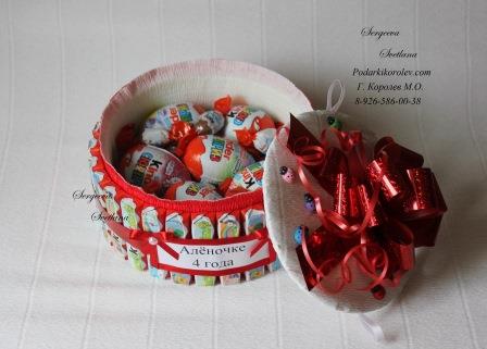 Киндер торт, чаще покупают для девушек, чем для детишек)))) В стоимость входит 29 киндер шоколадок с внешней стороны, упаковка в слюду, бант на торте и лента на слюде. Внутрь возможно положить Шоко бонс, киндер сюрприз, киндер шоколад, сертификат и многое другое, всё зависит от бюджета)))
